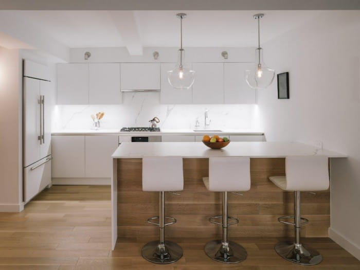 L-Shaped countertop goes perfectly well with the open interiors. You can also use it as a quick dining table and an additional space to keep some fancy decor products. As they are super easy to clean and maintain, you don’t have to worry about the station.
